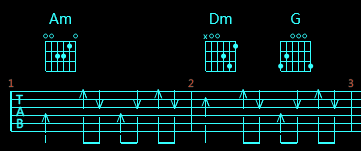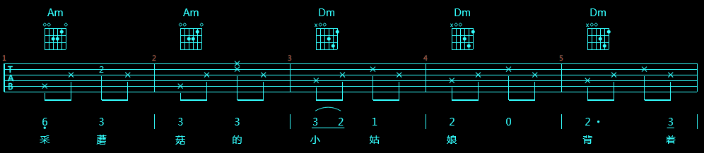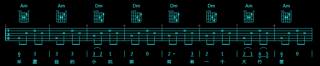 第一小节:@前面的为和弦,代表第一小节使用和弦为Am,这个Am在【吉他和弦】一定是已经设置过了。@后面紧跟的ex代表弹Am和弦的第五弦,ex之后跟着一个/,这个是代表这个弹的音时值为半拍(参照时值符号说明),接下来一个是cx代表弹第三弦,时值也为半拍。后面的b2,代表弹第二弦第2品的音,也就是说弦符号的后面不一定跟着是x除此之外还可以是数字,不按品位时为0,如a0代表弹第一弦空弦音。