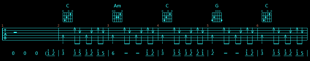 它的代码为:Nul@<n>~|C@<pfd><pca>/<uca>/<pfd>/<uca>/<pca>/<uca>/|Am@<pfd><pca>/<uca>/<pfd>/<uca>/<pca>/<uca>/|C@<pfd><pca>/<uca>/<pfd>/<uca>/<pca>/<uca>/|G@<pfd><pca>/<uca>/<pfd>/<uca>/<pca>/<uca>/|C@<pfd><pca>/<uca>/<pfd>/<uca>/<pca>/<uca>/|