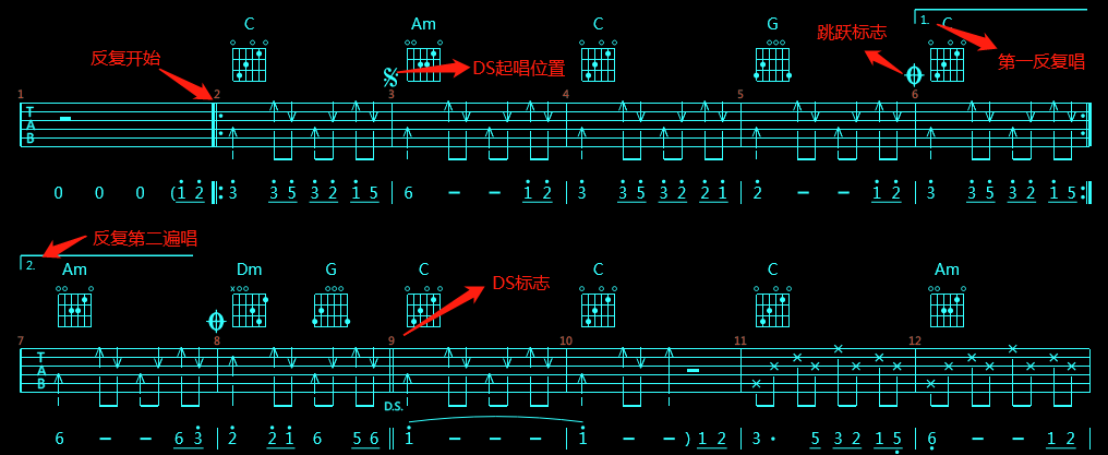 DS标志(<ds>),请注意DS标志为当前小节的最后一个音后面。