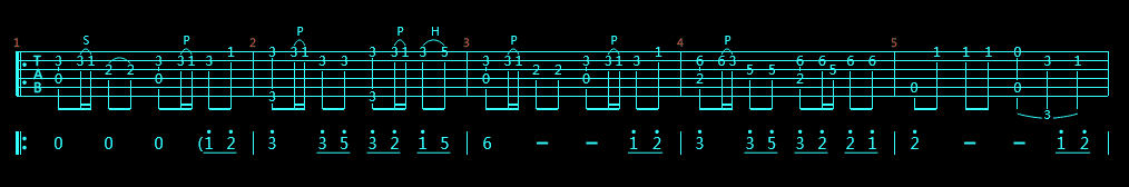其他重要内容,如歌曲的循环标志,DS标志,反复标志,FINE标志等,还有连音设置,击弦设置(H),勾弦设置(P),滑音设置(S)请看下面的示范: